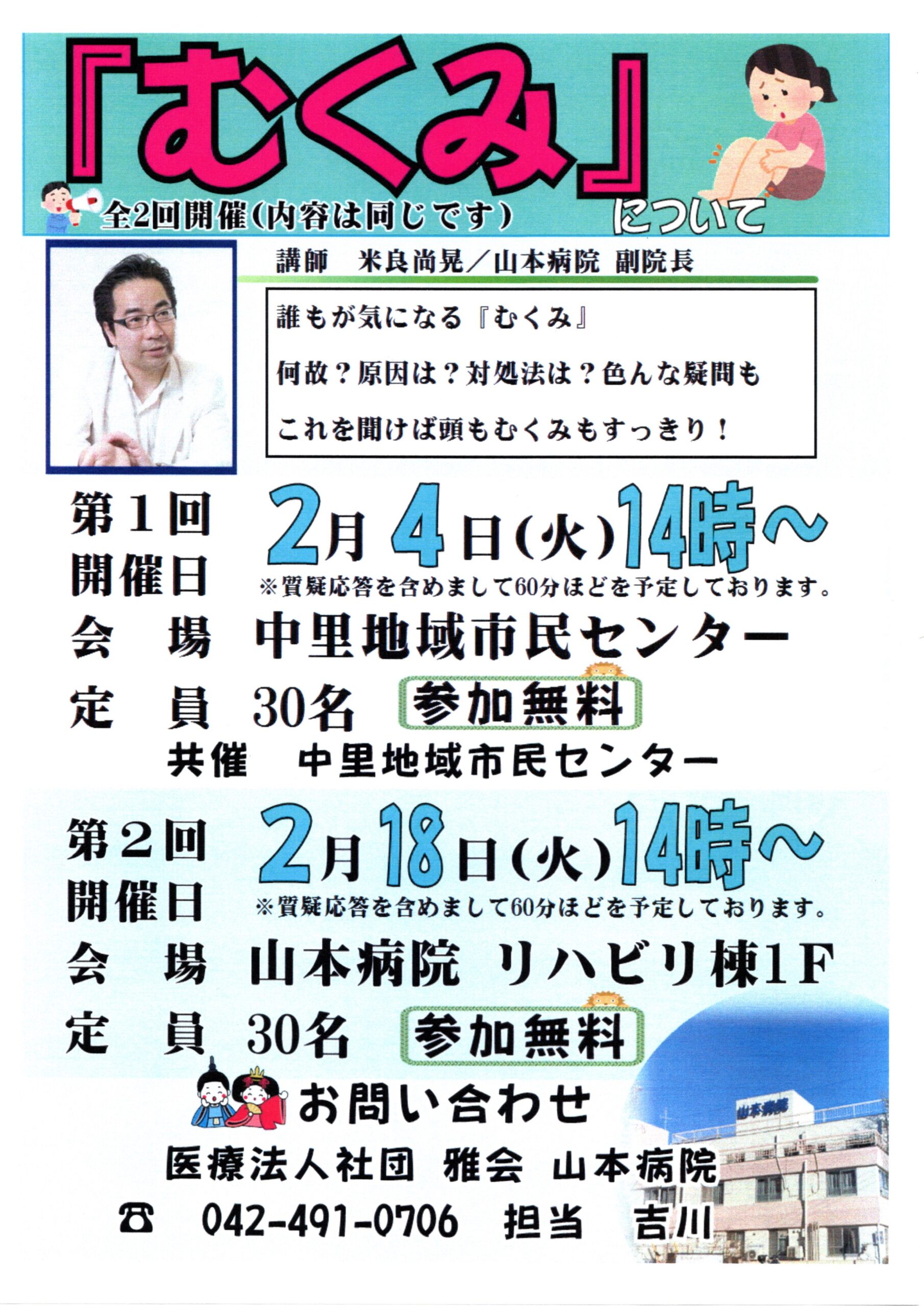 お知らせ 「むくみ」についての健康講座開催のお知らせ 記事公開日 2025/01/21 このたび、「むくみ」について、原因や対処法などを学べる健康講座(無料)を開催いたします。 ご都合の良い日程にぜひご参加ください。
